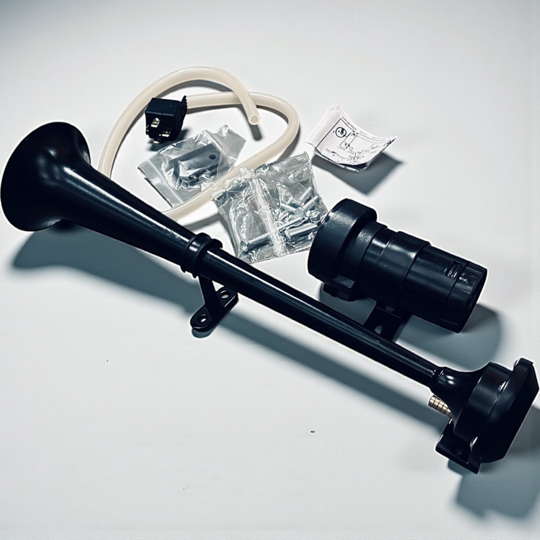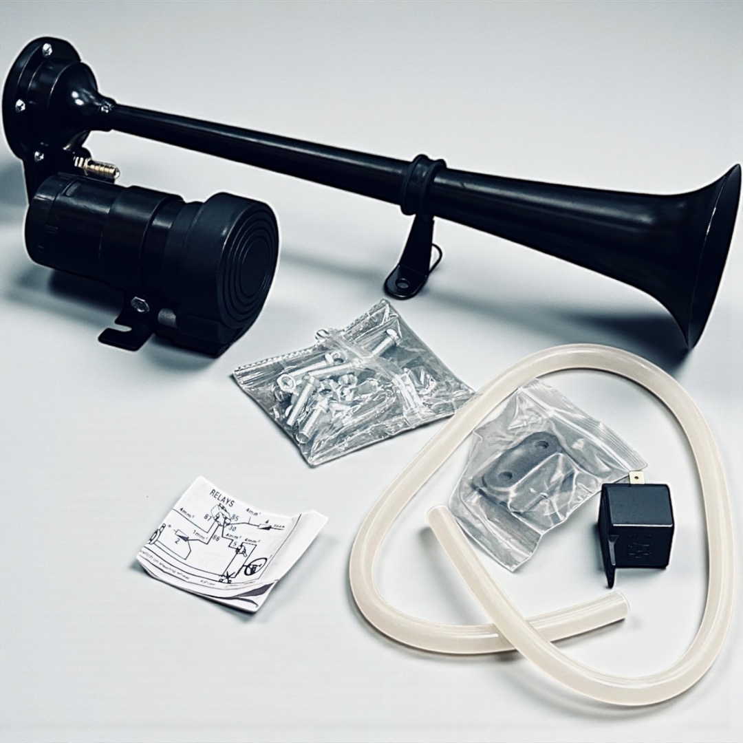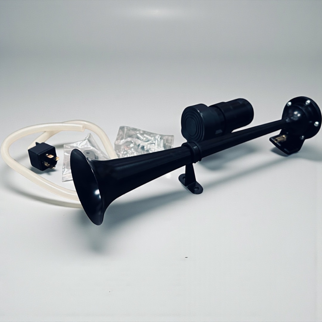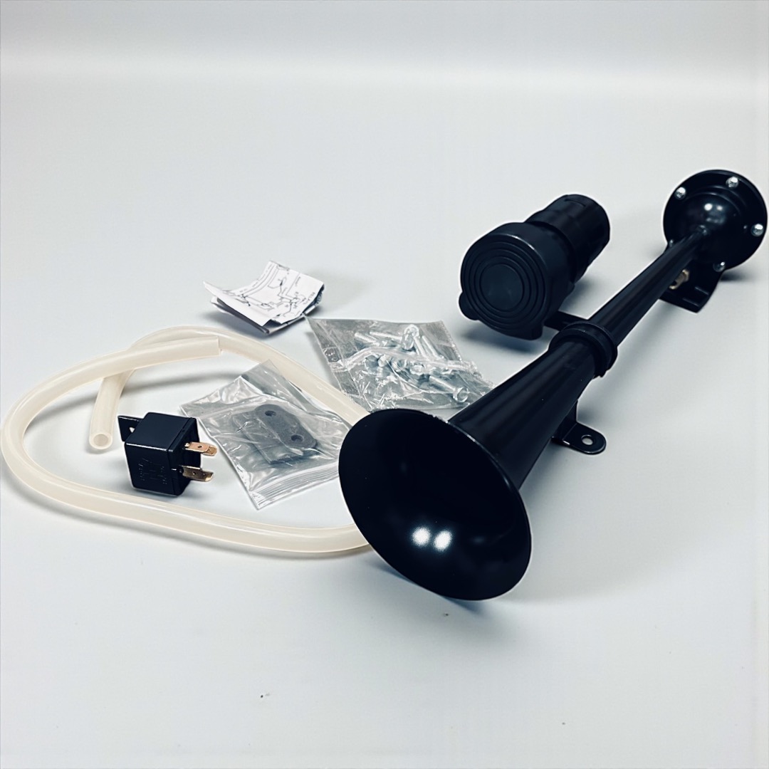 Lengte van de luchthoorn is 39 centimeter. Geeft een krachtig geluid, ondanks z'n klein formaat. Makkelijk in te bouwen.