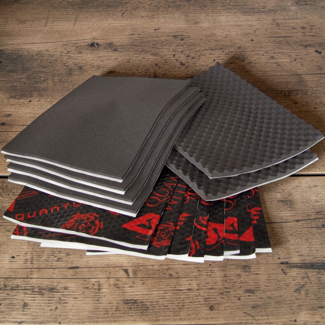 Voorkomt trillen en dempt geluid naar binnen. De set bestaat uit drie verschillende platen die samen optimaal het geluid dempt. 1. Aluminum bitumen matten 2. Akoestische zachte foam mat 3. Akoestische bobbel foam mat